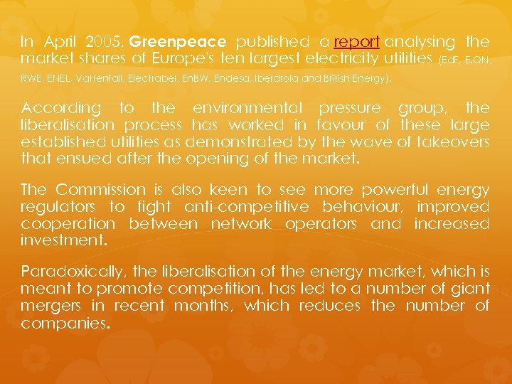 In April 2005, Greenpeace published a report analysing the market shares of Europe's ten largest electricity utilities (Ed. F, E. ON, RWE, ENEL, Vattenfall, Electrabel, En. BW, Endesa, Iberdrola and British Energy). According to the environmental pressure group, the liberalisation process has worked in favour of these large established utilities as demonstrated by the wave of takeovers that ensued after the opening of the market. The Commission is also keen to see more powerful energy regulators to fight anti-competitive behaviour, improved cooperation between network operators and increased investment. Paradoxically, the liberalisation of the energy market, which is meant to promote competition, has led to a number of giant mergers in recent months, which reduces the number of companies.