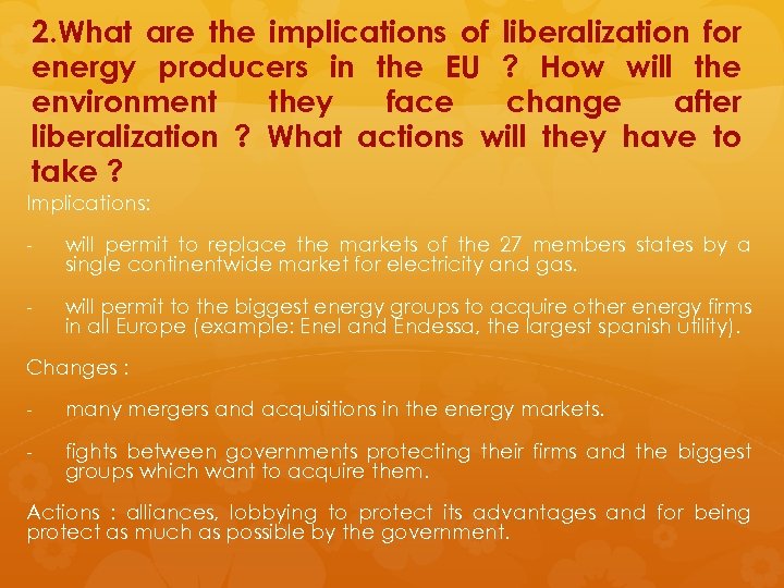 2. What are the implications of liberalization for energy producers in the EU ? How will the environment they face change after liberalization ? What actions will they have to take ? Implications: - will permit to replace the markets of the 27 members states by a single continentwide market for electricity and gas. - will permit to the biggest energy groups to acquire other energy firms in all Europe (example: Enel and Endessa, the largest spanish utility). Changes : - many mergers and acquisitions in the energy markets. - fights between governments protecting their firms and the biggest groups which want to acquire them. Actions : alliances, lobbying to protect its advantages and for being protect as much as possible by the government.