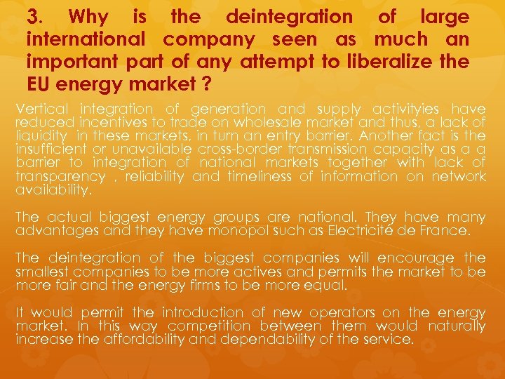 3. Why is the deintegration of large international company seen as much an important part of any attempt to liberalize the EU energy market ? Vertical integration of generation and supply activityies have reduced incentives to trade on wholesale market and thus, a lack of liquidity in these markets, in turn an entry barrier. Another fact is the insufficient or unavailable cross-border transmission capacity as a a barrier to integration of national markets together with lack of transparency , reliability and timeliness of information on network availability. The actual biggest energy groups are national. They have many advantages and they have monopol such as Electricité de France. The deintegration of the biggest companies will encourage the smallest companies to be more actives and permits the market to be more fair and the energy firms to be more equal. It would permit the introduction of new operators on the energy market. In this way competition between them would naturally increase the affordability and dependability of the service.