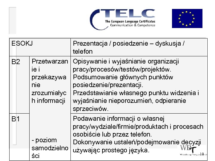 ESOKJ Prezentacja / posiedzenie – dyskusja / telefon B 2 Przetwarzan ie i przekazywa nie zrozumiałyc h informacji Opisywanie i wyjaśnianie organizacji pracy/procesów/testów/projektów. Podsumowanie głównych punktów posiedzenie/prezentacji. Przedstawianie własnego punktu widzenia i wyjaśnianie nieporozumień, odpieranie sprzeciwów. B 1 Podawanie informacji o własnej pracy/wydziale/firmie/produktach i procesach osobiście lub przez telefon. - poziom Dokonywanie ustaleń/podejmowanie decyzji samodzielno używając prostego języka. 10 ści