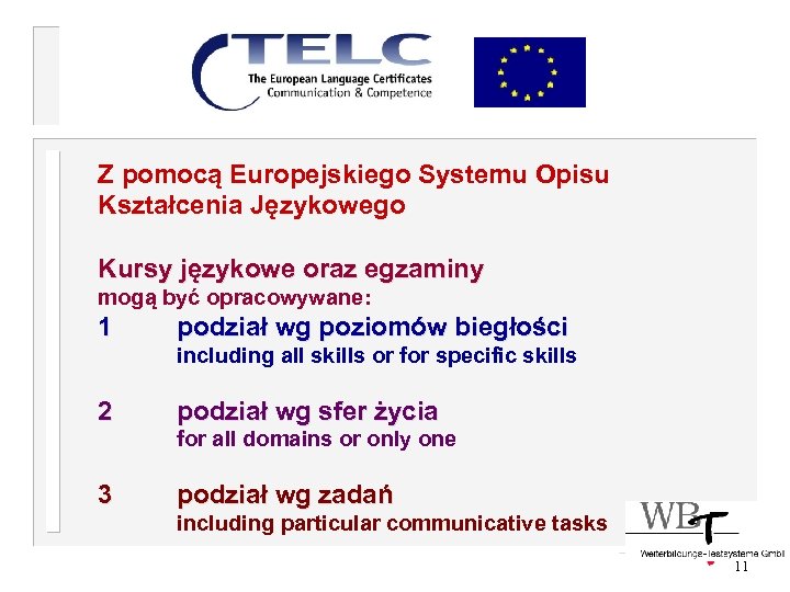 Z pomocą Europejskiego Systemu Opisu Kształcenia Językowego Kursy językowe oraz egzaminy mogą być opracowywane: 1 podział wg poziomów biegłości including all skills or for specific skills 2 podział wg sfer życia for all domains or only one 3 podział wg zadań including particular communicative tasks 11