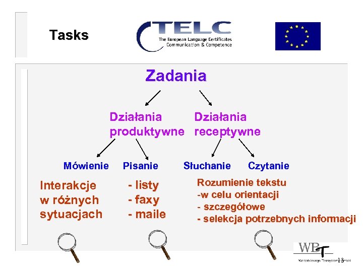 Jak określić kompetencje językowe? Język jakiego potrzebujemy do komunikowania się w Europie w 21 wieku jest nastawiony na wykonywanie zadań! 12