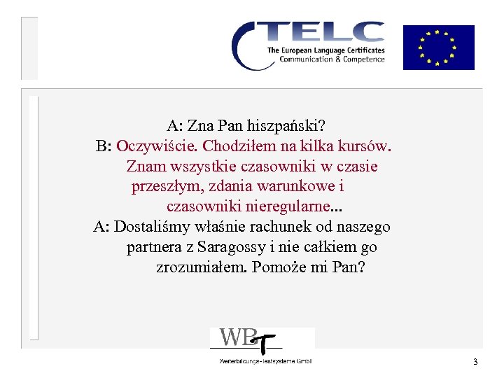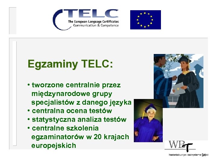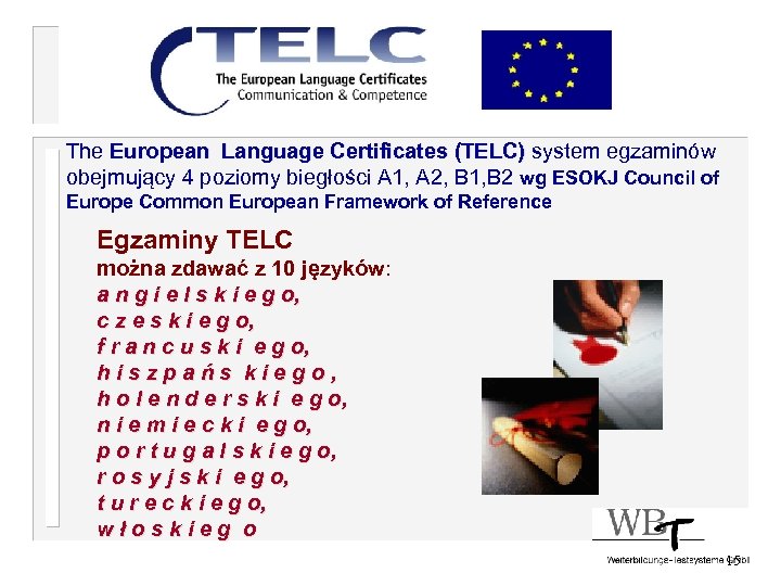 The European Language Certificates (TELC) system egzaminów obejmujący 4 poziomy biegłości A 1, A 2, B 1, B 2 wg ESOKJ Council of Europe Common European Framework of Reference Egzaminy TELC można zdawać z 10 języków: a n g i e l s k i e g o, c z e s k i e g o, f r a n c u s k i e g o, hiszpańs kiego, h o l e n d e r s k i e g o, n i e m i e c k i e g o, p o r t u g a l s k i e g o, r o s y j s k i e g o, t u r e c k i e g o, włoskieg o 15