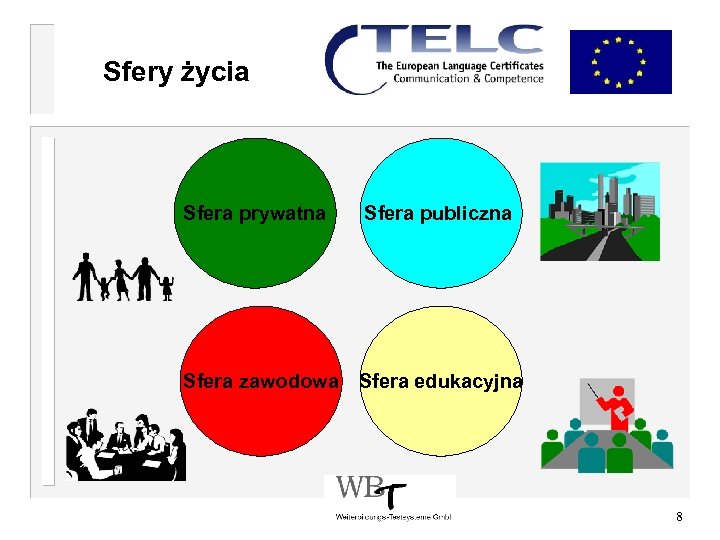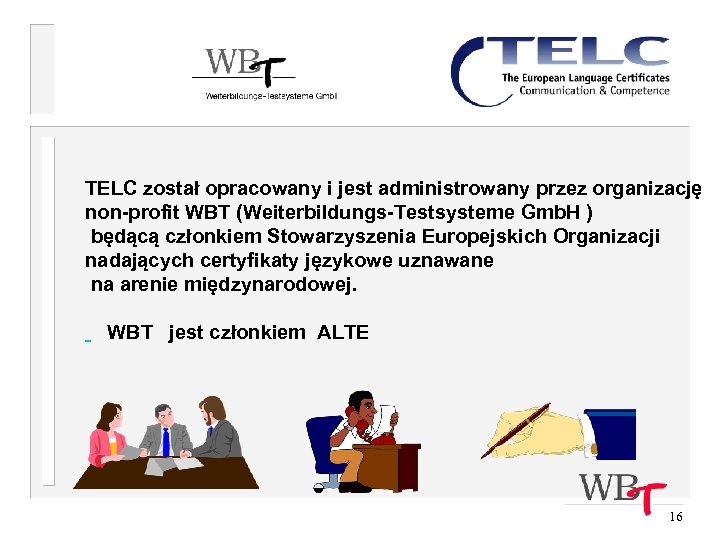 The WBT Weiterbildungs-Testsysteme Gmb. H is a member of ALTE Association of Language Testers in Europe Other members are: Goethe Institut (D) Università per Stranieri di Perugia (I) University of Cambridge (GB) Universidad de Salamanca (E) as well as other recognised European examination boards. 17