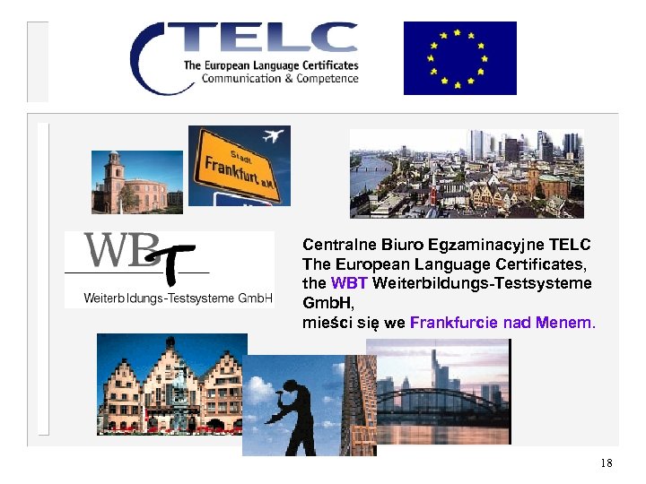 Centralne Biuro Egzaminacyjne TELC The European Language Certificates, the WBT Weiterbildungs-Testsysteme Gmb. H, mieści się we Frankfurcie nad Menem. 18