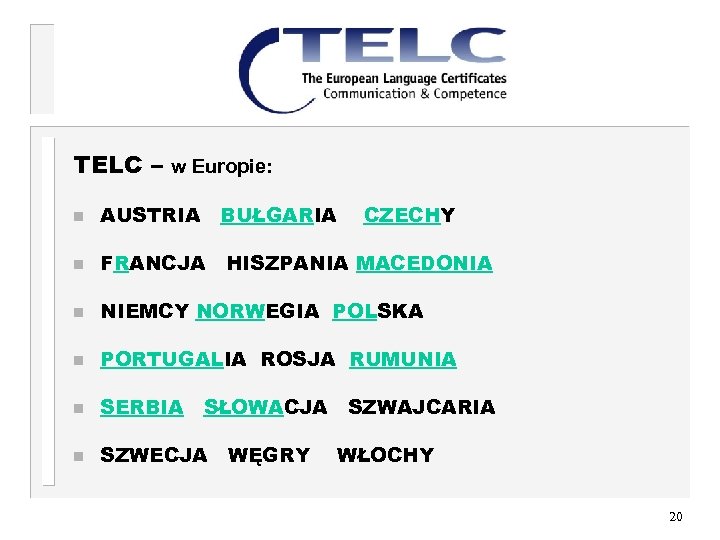 TELC w Europe Organizacje partnerskie w 20 krajach europejskich. Ponad 4000 Centrów Egzaminacyjnych 40 różnych egzaminów w 10 językach Ponad 6000 egzaminatorów W Polsce 65 Centrów Egzaminacyjnych oraz ok. 200 Ośrodków Egzaminacyjnych 19