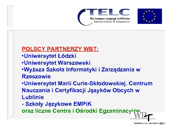 POLSCY PARTNERZY WBT: • Uniwersytet Łódzki • Uniwersytet Warszawski • Wyższa Szkoła Informatyki i Zarządzania w Rzeszowie • Uniwersytet Marii Curie-Skłodowskiej. Centrum Nauczania i Certyfikacji Języków Obcych w Lublinie - Szkoły Językowe EMPi. K oraz liczne Centra i Ośrodki Egzaminacyjne 21