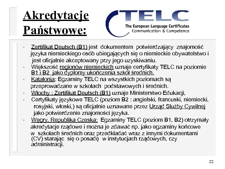 Akredytacje Państwowe: § § § Zertifikat Deutsch (B 1) jest dokumentem potwierdzający znajomość języka niemieckiego osób ubiegających się o niemieckie obywatelstwo i jest oficjalnie akceptowany przy jego uzyskiwaniu. Większość regionów niemieckich uznaje certyfikaty TELC na poziomie B 1 i B 2 jako dyplomy ukończenia szkół średnich. Katalonia: Egzaminy TELC na wszystkich poziomach są przeprowadzane w szkołach podstawowych i średnich. Włochy : Zertifikat Deutsch (B 1) uznaje Ministerstwo Edukacji, Certyfikaty językowe TELC (poziom B 2 : angielski, francuski, niemiecki, rosyjski, włoski, ) są oficjalnie uznawane przez Urząd Służby Cywilnej jako potwierdzenie znajomości języka. Węgry, Republika Czeska: Egzaminy TELC (poziom B 1, B 2) otrzymały akredytacje rządowe i można je zdawać np. jako egzaminy końcowe w szkołach średnich oraz przedkładać wraz z innymi dokumentami (CV) starając się o posadę w instytucjach rządowych, czy administracji. 22