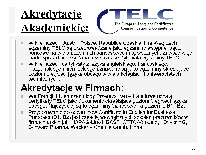 Akredytacje Akademickie: n n W Niemczech, Austrii, Polsce, Republice Czeskiej i na Węgrzech egzaminy TELC są przeprowadzane jako egzaminy wstępne, bądź końcowe na wielu uczelniach państwowych i społecznych. Zawsze więc warto sprawdzić, czy dana uczelnia akredytowała egzaminy TELC. W Niemczech certyfikaty z języka angielskiego, francuskiego, hiszpańskiego i niemieckiego uznawane są jako egzaminy określające poziom biegłości języka obcego w wielu kolegiach i uniwersytetach technicznych. Akredytacje w Firmach: n n We Francji i Niemczech Izby Przemysłowo – Handlowe uznają certyfikaty TELC jako dokumenty określające poziom biegłości języka obcego. Najczęściej są to egzaminy biznesowe na poziomie B 1 i B 2. Przygotowanie do egzaminów Certificate in English for Business Purposes (B 1, B 2) jest częścią wewnętrznych szkoleń pracowników w firmach takich jak HAPAG-Lloyd, BASF, OTTO-Versand, , Bayer AG, Schwarz Pharma, Wacker – Chemie Gmbh, i inne. 23