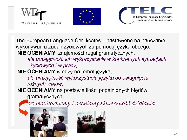 The European Language Certificates – nastawione na nauczanie wykonywania zadań życiowych za pomocą języka obcego. NIE OCENIAMY znajomości reguł gramatycznych, ale umiejętność ich wykorzystania w konkretnych sytuacjach życiowych i w pracy, NIE OCENIAMY wiedzy na temat języka, ale umiejętność wykorzystania języka do osiągnięcia różnych celów. NIE OCENIAMY na postawie ilości popełnionych błędów gramatycznych, ale monitorujemy i oceniamy skuteczność działania 25