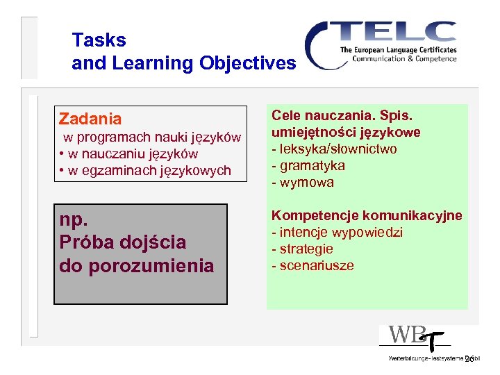 Tasks and Learning Objectives w programach nauki języków • w nauczaniu języków • w egzaminach językowych Cele nauczania. Spis. umiejętności językowe - leksyka/słownictwo - gramatyka - wymowa np. Próba dojścia do porozumienia Kompetencje komunikacyjne - intencje wypowiedzi - strategie - scenariusze Zadania 26