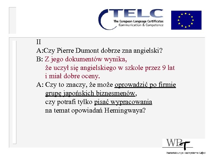 II A: Czy Pierre Dumont dobrze zna angielski? B: Z jego dokumentów wynika, że uczył się angielskiego w szkole przez 9 lat i miał dobre oceny. A: Czy to znaczy, że może oprowadzić po firmie grupę japońskich biznesmenów, czy potrafi tylko pisać wypracowania na temat opowiadań Hemingwaya? 4