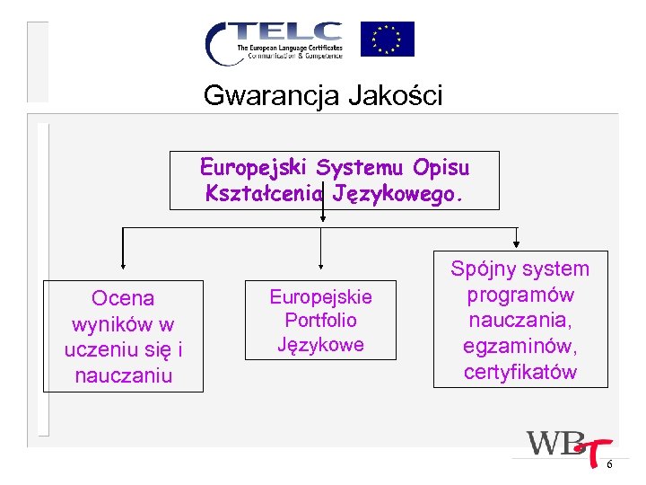 Gwarancja Jakości Europejski Systemu Opisu Kształcenia Językowego. Ocena wyników w uczeniu się i nauczaniu Europejskie Portfolio Językowe Spójny system programów nauczania, egzaminów, certyfikatów 6