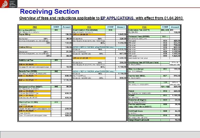 EPO Fees from 1. 4. 2010 Filing phase EUR 1 295 Online applications EUR 1 210 Examination phase EUR 2 425 Grant phase EUR 1 355 Total procedural fees EUR 5 075 Online applications EUR 4 990