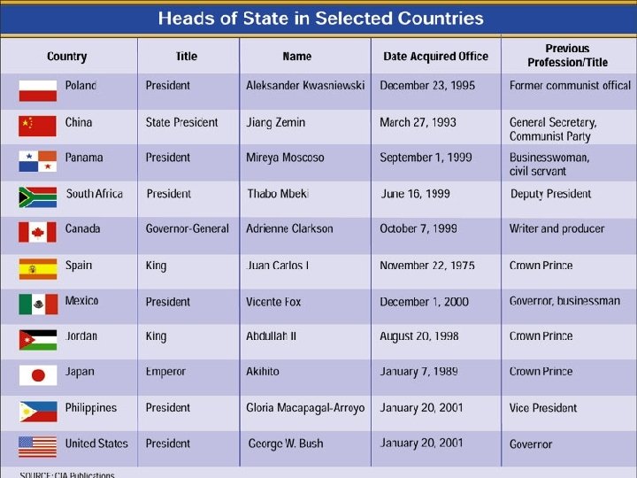 Head of Government - official leader of our government - appoints people to lead government agencies and departments (Senate must approve all appointments) - appoints judges (Senate must approve all appointments) -see’s that nations laws are carried out