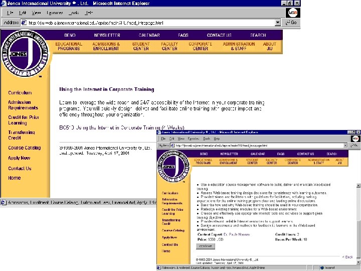 Certificate: Using the Internet in Corp Training Jones International University • Corp trainers retool existing content for online delivery; build an online module • 4 weeks, $550; also optional customized corp training certificate • Use Web to enhance course content, & create a powerful, interactive learning environment for trainees.