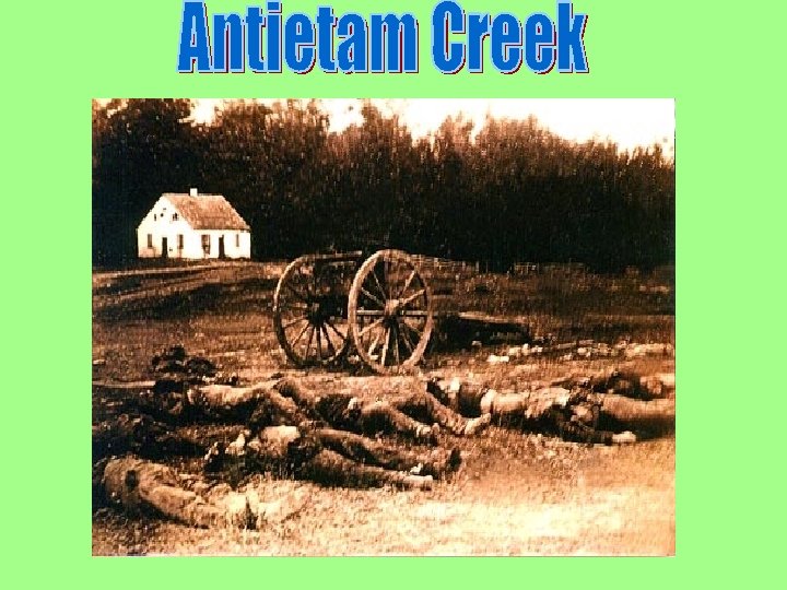 Antietam Creek Sharpsburg, Maryland Union Commander: General George Mc. Clellan Confederate Commander: General Robert E. Lee September 17, 1862 Casualties: Union-12, 410 Confederate -13, 724 Winner: Union…barely!