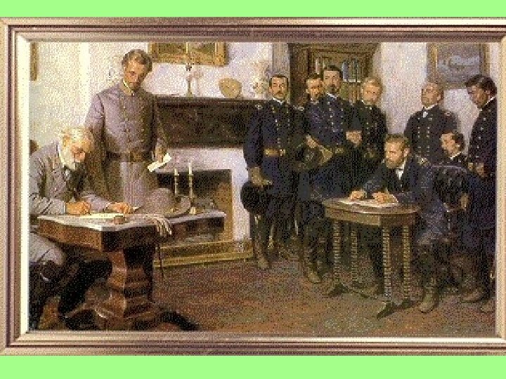 On April 9, 1865 Robert E. Lee surrendered his army of Northern Virginia in a little village called Appomattox Courthouse. Lee surrendered formally to Ulysses S. Grant. The papers of formal surrender were signed in the home of Wilmer Mclean, whose first house was damaged during the first battle of the Civil War.