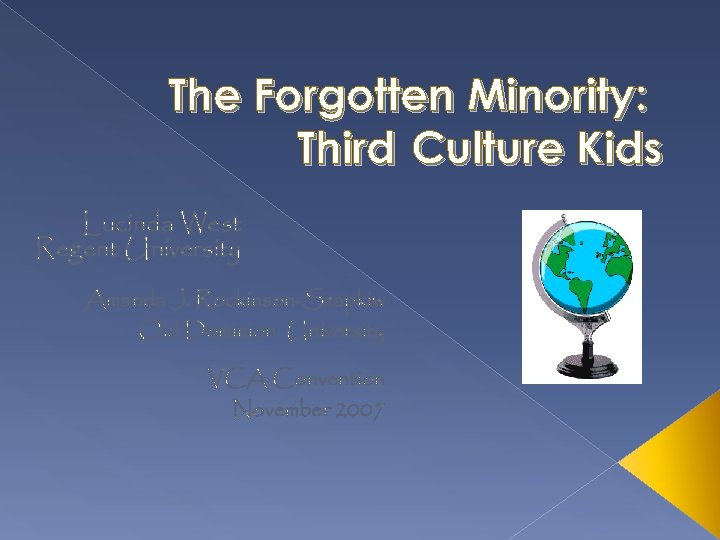 The Forgotten Minority: Third Culture Kids Lucinda West Regent University Amanda J. Rockinson-Szapkiw Old Dominion University VCA Convention November 2007