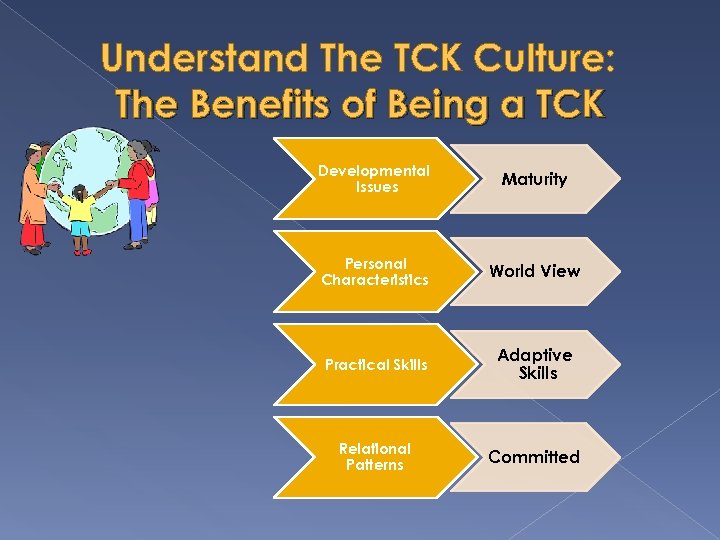 Understand The TCK Culture: The Benefits of Being a TCK Developmental Issues Maturity Personal Characteristics World View Practical Skills Adaptive Skills Relational Patterns Committed