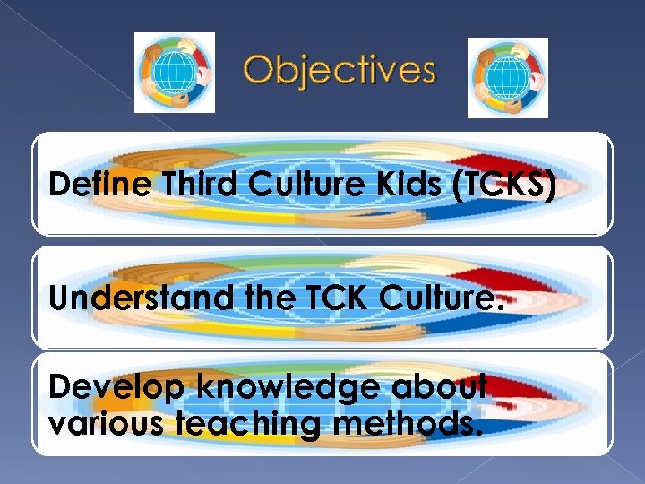 Objectives Define Third Culture Kids (TCKS) Understand the TCK Culture. Develop knowledge about various teaching methods.