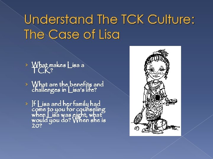 Understand The TCK Culture: The Case of Lisa › What makes Lisa a TCK? › What are the benefits and challenges in Lisa’s life? › If Lisa and her family had come to you for counseling when Lisa was eight, what would you do? When she is 20?