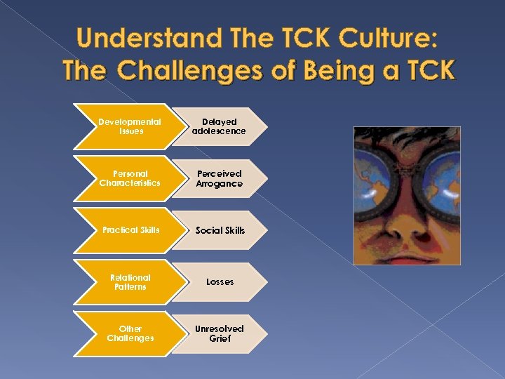 Understand The TCK Culture: The Challenges of Being a TCK Developmental Issues Delayed adolescence Personal Characteristics Perceived Arrogance Practical Skills Social Skills Relational Patterns Losses Other Challenges Unresolved Grief