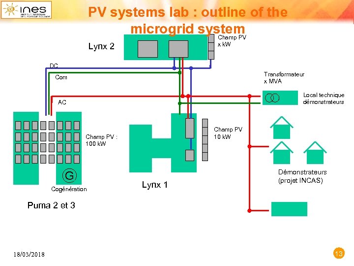 PV systems lab : outline of the microgrid system Champ PV x k. W Lynx 2 DC Transformateur x MVA Com Local technique démonstrateurs AC Champ PV 10 k. W Champ PV : 100 k. W G Cogénération Lynx 1 Démonstrateurs (projet INCAS) Puma 2 et 3 18/03/2018 13