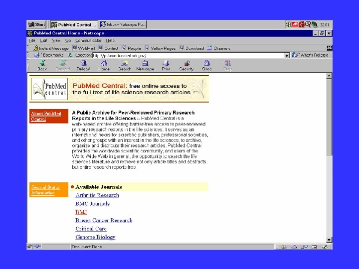 Journals that will appear on Pubmed Central • • Biomed central Bulletin of the Medical Library Association Canadian Medical Association Journal of American Medical Informatics Journal of Medical Entomology Nucleic Acids Research The Plant Cell Plant Physiology