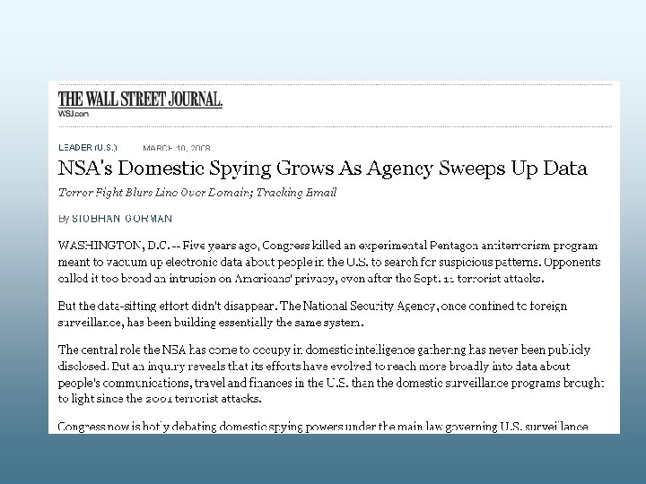 The Security State • NSA: 30, 000 employees • CIA: 20, 000 employees • Others: many more • Overall IC: at least $57 billion • Oversight? Not much. • FBI: 33, 000