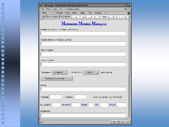 Who encodes Metadata in digital Documents ? ê The author of the document is willing to spend a little bit more time to write good and correct metadata (e. g. MSC-Class) ê Implementation of suitable tools that help the author prepare the required metadata