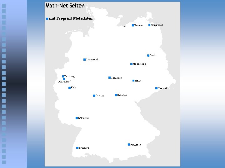 Statistics ê Math. Net: m 64 German/Austrian Mathematical Department ê Preprints (MPRESS/Math. Net. preprints: Germany, Austria, France, LANL, plus. . . ) m m ca. 36. 000 (115 servers) ca. 10. 000 with Dublin Core Metadata