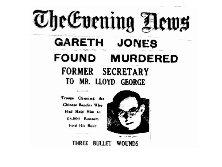 Gareth Jones – A Man Who Knew Too Much On Friday 16 th August, upon hearing of Gareth’s murder, Lloyd George commented in The London Evening Standard: “I was struck with horror when the news of poor Mr Gareth Jones was conveyed to me. I was uneasy about his fate from the moment I ascertained that when his companion, Dr Herbert Müller, was released he was detained. ” “That part of the world is a cauldron of conflicting intrigue and one or other interests concerned probably knew that Mr Gareth Jones knew too much of what was going on…
