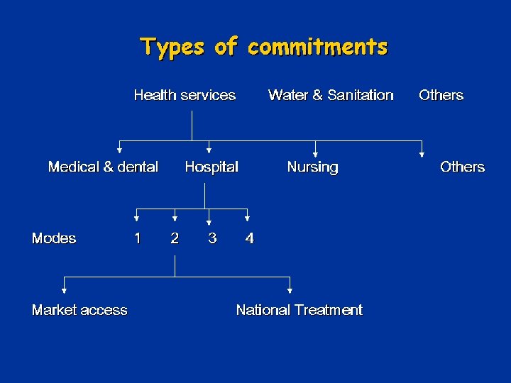Modes of services: opportunities and risks for the Heath Care Systems Modes Opportunities Risks 1 Increase care to remote and underserved areas Diversion of resources from other health services 2 Generates foreign exchange earnings for health services of importing country Crowding out of local population and diversion of resources to service foreign nationals 3 Creates opportunities for new employment and access to new technologies Development of two-tiered health system, with an internal brain drain 4 Economic gains from remittances of health Permanent outflow of health personnel, with loss of