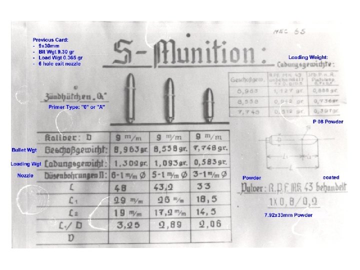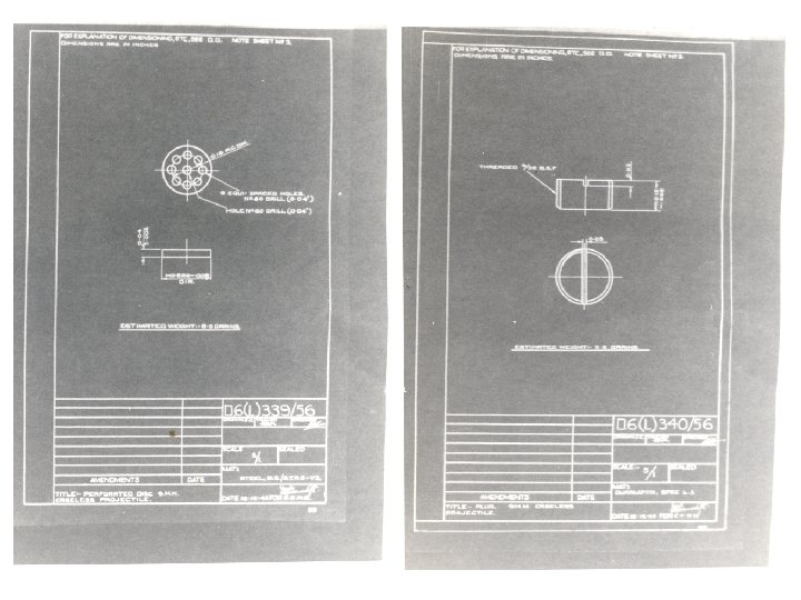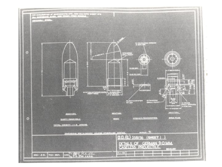 British 9 mm Rocket Cartridges • Chief Superintendent Armament Research – Ft Halstead 30/8/45 – Based on work published in 1939 by Langweiler on impulse-propulsion – Testing done with modified 7. 92 x 57 tracer increased MV by 150 ft/sec – Recommended British Conduct Experiments • Use Lab mockup weapon • Start with an exact copy of the German bullet • Recommended various types of propellants which could be tried • Sir Dennis Burney – (for B. T. Co. ? ? ? ) 14/9/45 – Describes the German rocket bullet – References test of “rocket projectiles” in the Hotchkiss 6 pdr. • Attached Minutes – Preliminary designs being manufactured at Radway Green – 23/1/46 – Trials of D 6(B) 341/56 and D 6(B) 338/56 with propellent P. 16454 – 5/3/47 • 341/56 fired satisfactorily • 338/56 blew out duralumin nose plug before complete pressure buildup – Worked with steel nose plug • Requested further tests of 250 rounds – order confirmed – Trial at ROF Swynnerton terminated 29/8/47