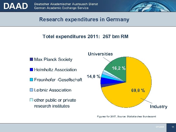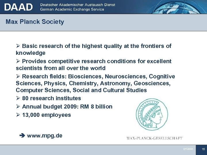 The German research landscape Ø About 250, 000 scientists Ø Third largest research country in the world (total number of researchers) Ø More than 750 state-funded scientific institutes Ø Top-level research in German companies 07/2008 10
