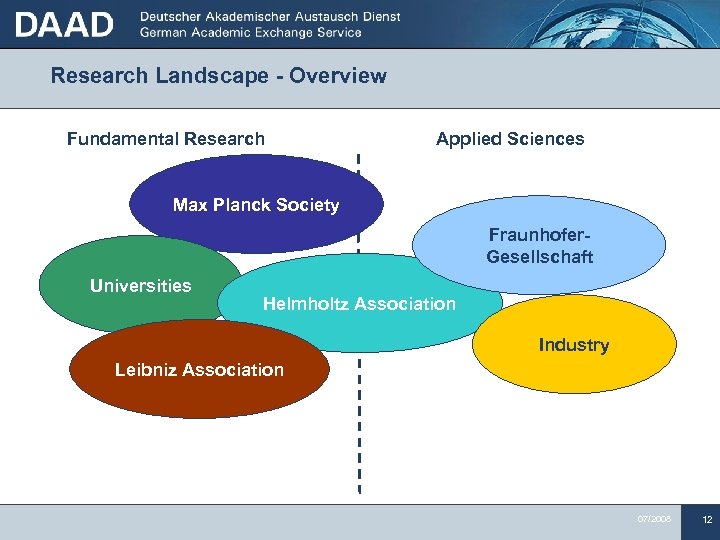 Research Landscape - Overview Fundamental Research Applied Sciences Max Planck Society Fraunhofer. Gesellschaft Universities Helmholtz Association Industry Leibniz Association 07/2008 12
