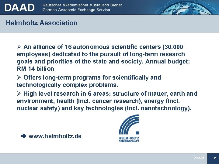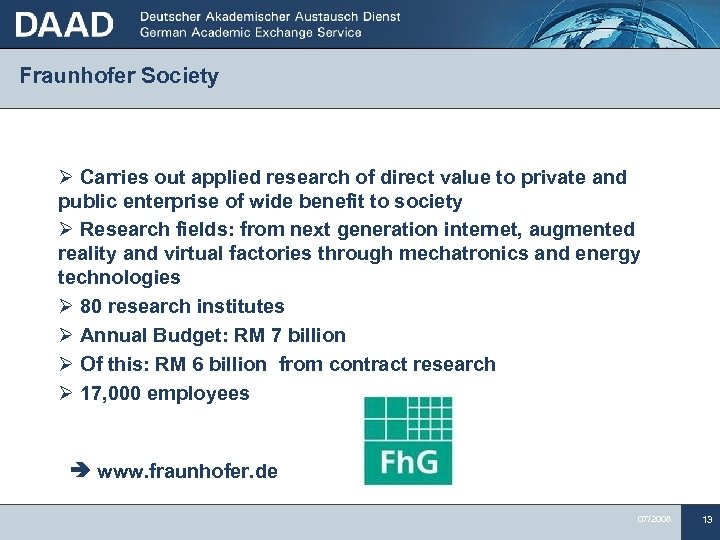 Fraunhofer Society Ø Carries out applied research of direct value to private and public enterprise of wide benefit to society Ø Research fields: from next generation internet, augmented reality and virtual factories through mechatronics and energy technologies Ø 80 research institutes Ø Annual Budget: RM 7 billion Ø Of this: RM 6 billion from contract research Ø 17, 000 employees www. fraunhofer. de 07/2008 13
