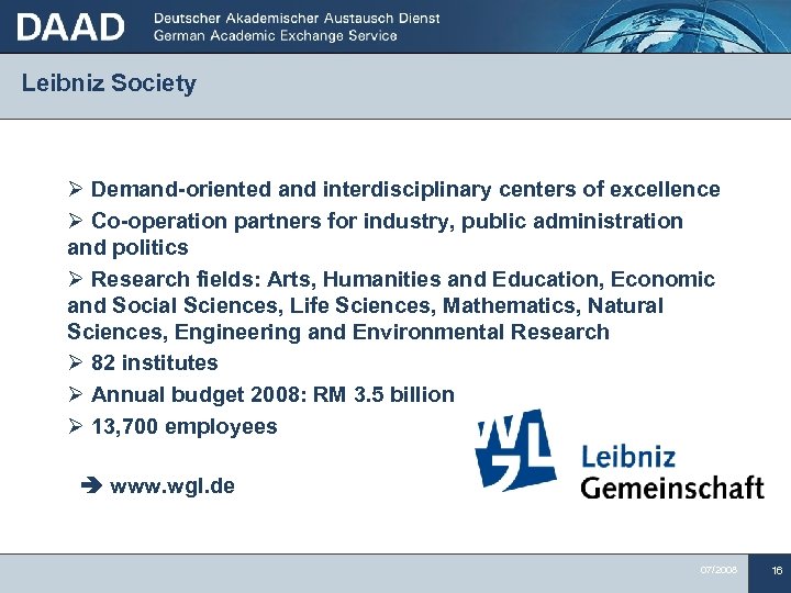 Leibniz Society Ø Demand-oriented and interdisciplinary centers of excellence Ø Co-operation partners for industry, public administration and politics Ø Research fields: Arts, Humanities and Education, Economic and Social Sciences, Life Sciences, Mathematics, Natural Sciences, Engineering and Environmental Research Ø 82 institutes Ø Annual budget 2008: RM 3. 5 billion Ø 13, 700 employees www. wgl. de 07/2008 16
