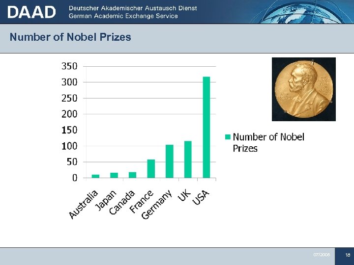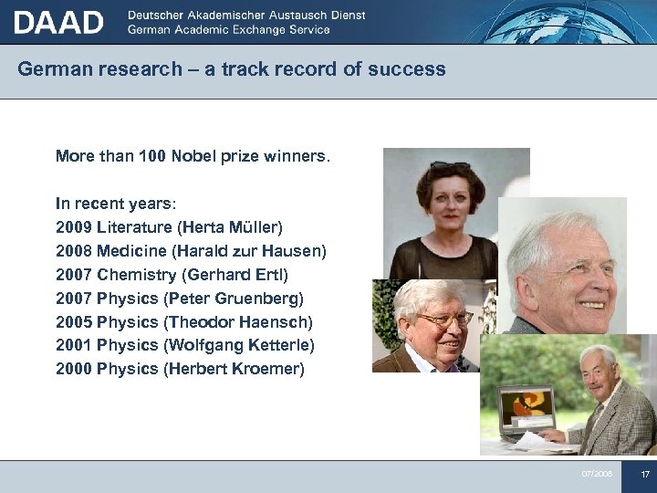 German research – a track record of success More than 100 Nobel prize winners. In recent years: 2009 Literature (Herta Müller) 2008 Medicine (Harald zur Hausen) 2007 Chemistry (Gerhard Ertl) 2007 Physics (Peter Gruenberg) 2005 Physics (Theodor Haensch) 2001 Physics (Wolfgang Ketterle) 2000 Physics (Herbert Kroemer) 07/2008 17