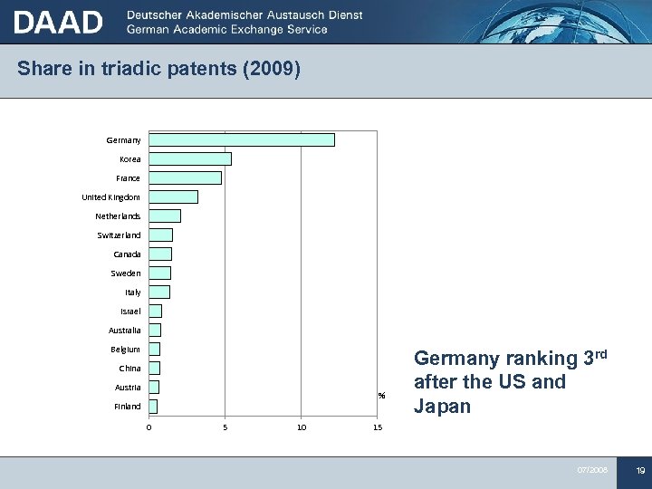 Share in triadic patents (2009) Germany Korea France United Kingdom Netherlands Switzerland Canada Sweden Italy Israel Australia Belgium China Austria % Finland 0 5 10 Germany ranking 3 rd after the US and Japan 15 07/2008 19
