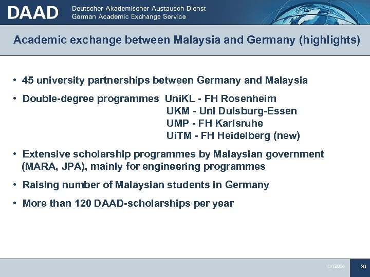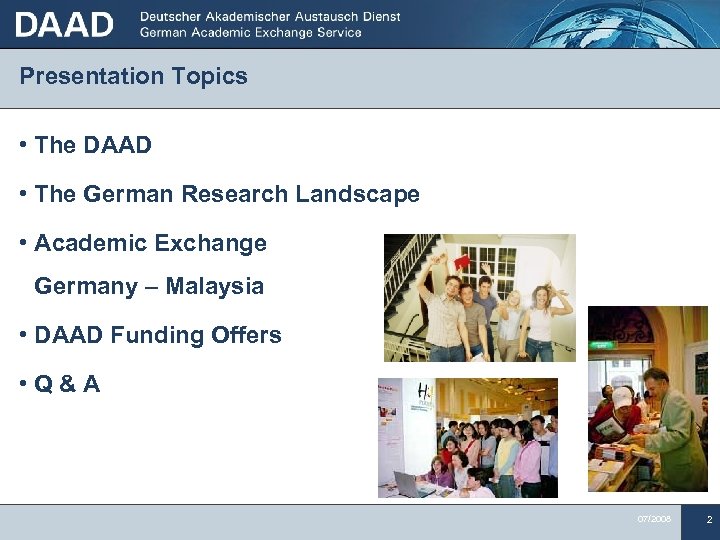 Presentation Topics • The DAAD • The German Research Landscape • Academic Exchange Germany – Malaysia • DAAD Funding Offers • Q & A 07/2008 2