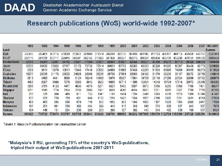 Research publications (Wo. S) world-wide 1992 -2007* *Malaysia‘s 5 RU, generating 75% of the country‘s Wo. S-publications, tripled their output of Wo. S-publications 2007 -2011 07/2008 21
