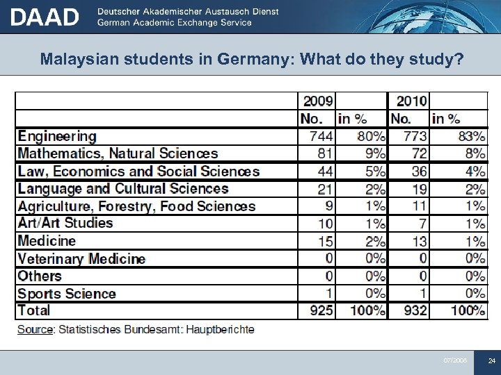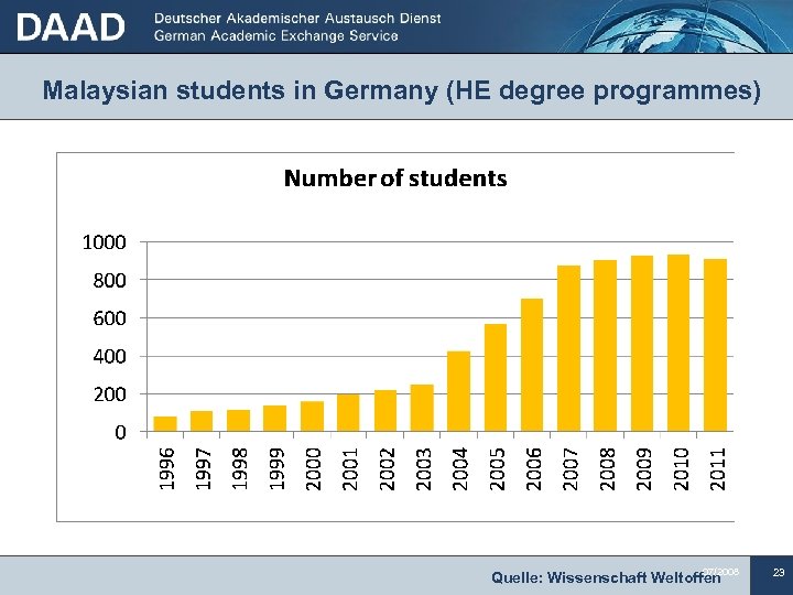 Malaysian students in Germany (HE degree programmes) 07/2008 Quelle: Wissenschaft Weltoffen 23