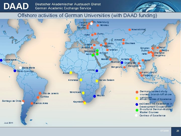 Offshore activities of German Universities (with DAAD funding) Tallinn Riga Kaunas St. Petersburg Moskau Kiew Nowosibirsk Sumy Almaty Ankara Antalya Damaskus Kairo Bischkek Teheran Amman Kolkata Maskat Mumbai Chiang Mai Bangkok Bengaluru Guadalajara Santa Marta Santo Domingo Jimma Rio de Janeiro Buenos Aires Seoul Beppu Shanghai Hangzhou Hanoi Dar es Salaam Windhoek Maputo Curitiba Qingdao Suzhou Hefei Kuala Lumpur Singapur Accra Kinshasa Santiago de Chile Baku Yerevan Germany backed study courses, branch-/off shore campuses African Centres of Excellence Kapstadt ex)/(ceed: HE Excellence in Development Cooperation Bi-cultural German-Arabic Master Courses Centres of Excellence Juni 2011 07/2008 26