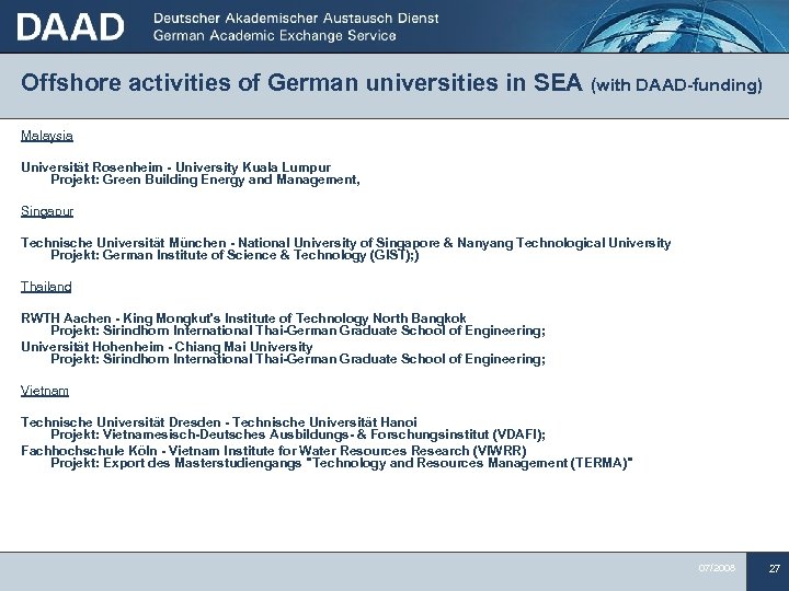 Offshore activities of German universities in SEA (with DAAD-funding) Malaysia Universität Rosenheim - University Kuala Lumpur Projekt: Green Building Energy and Management, Singapur Technische Universität München - National University of Singapore & Nanyang Technological University Projekt: German Institute of Science & Technology (GIST); ) Thailand RWTH Aachen - King Mongkut's Institute of Technology North Bangkok Projekt: Sirindhorn International Thai-German Graduate School of Engineering; Universität Hohenheim - Chiang Mai University Projekt: Sirindhorn International Thai-German Graduate School of Engineering; Vietnam Technische Universität Dresden - Technische Universität Hanoi Projekt: Vietnamesisch-Deutsches Ausbildungs- & Forschungsinstitut (VDAFI); Fachhochschule Köln - Vietnam Institute for Water Resources Research (VIWRR) Projekt: Export des Masterstudiengangs "Technology and Resources Management (TERMA)" 07/2008 27