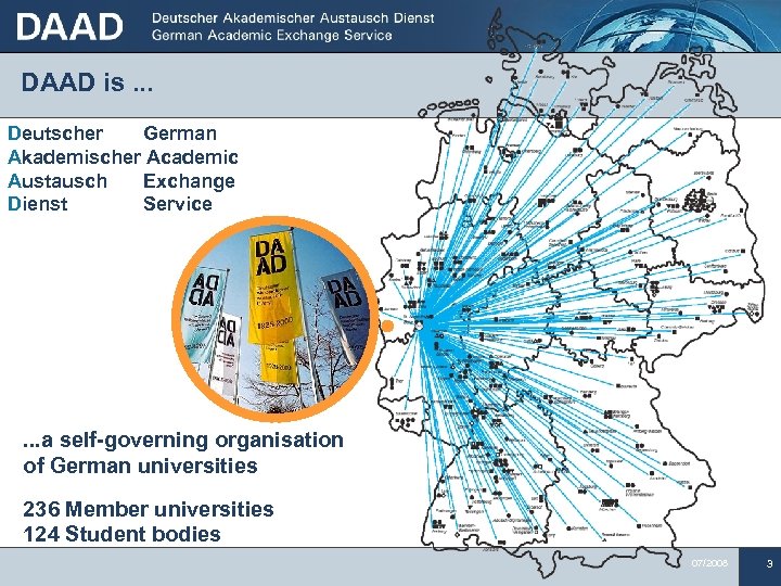 DAAD is. . . Deutscher German Akademischer Academic Austausch Exchange Dienst Service . . . a self-governing organisation of German universities 236 Member universities 124 Student bodies 07/2008 3