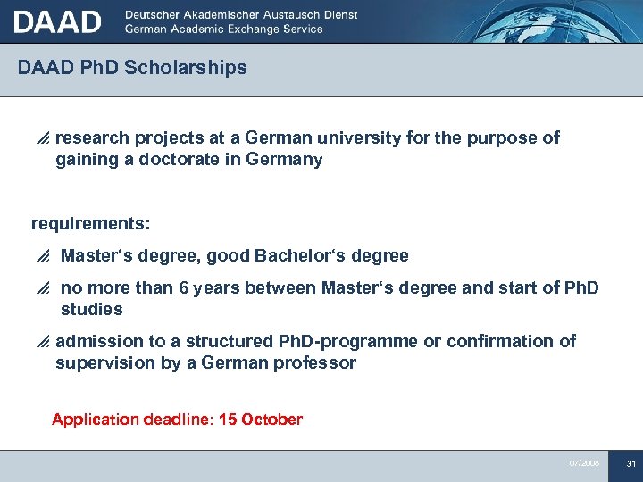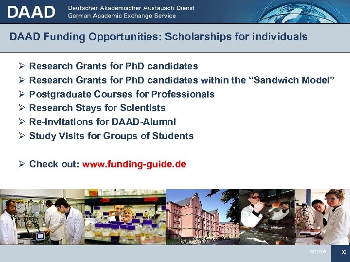 DAAD Funding Opportunities: Scholarships for individuals Ø Ø Ø Research Grants for Ph. D candidates within the “Sandwich Model” Postgraduate Courses for Professionals Research Stays for Scientists Re-Invitations for DAAD-Alumni Study Visits for Groups of Students Ø Check out: www. funding-guide. de 07/2008 30