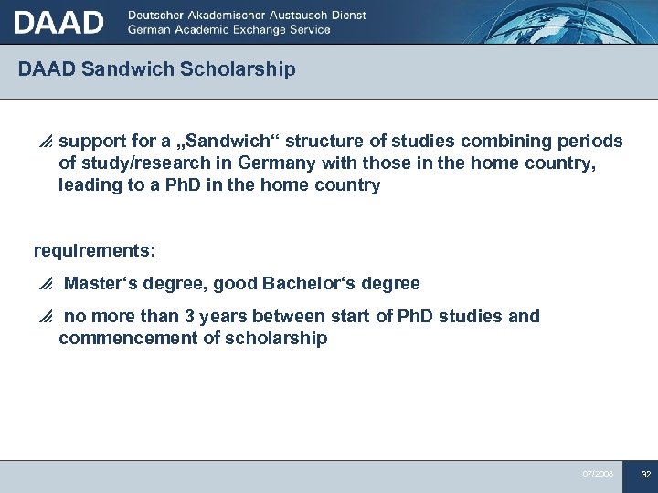 DAAD Ph. D Scholarships p research projects at a German university for the purpose of gaining a doctorate in Germany requirements: p Master‘s degree, good Bachelor‘s degree p no more than 6 years between Master‘s degree and start of Ph. D studies p admission to a structured Ph. D-programme or confirmation of supervision by a German professor Application deadline: 15 October 07/2008 31