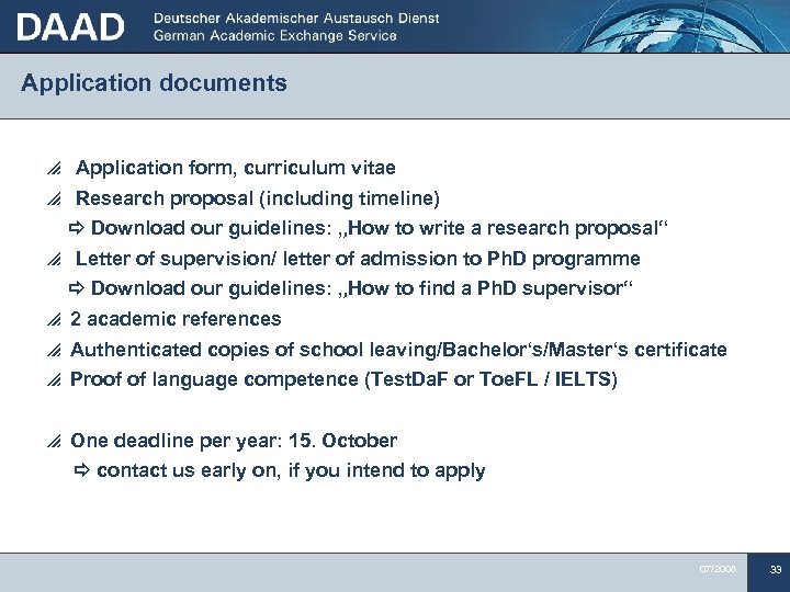 Application documents p Application form, curriculum vitae p Research proposal (including timeline) Download our guidelines: „How to write a research proposal“ p Letter of supervision/ letter of admission to Ph. D programme Download our guidelines: „How to find a Ph. D supervisor“ p 2 academic references p Authenticated copies of school leaving/Bachelor‘s/Master‘s certificate p Proof of language competence (Test. Da. F or Toe. FL / IELTS) p One deadline per year: 15. October contact us early on, if you intend to apply 07/2008 33
